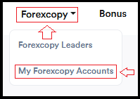 - Pilih menu Forexcopy => My Forexcopy Accounts. (Contoh gambar di bawah ini)