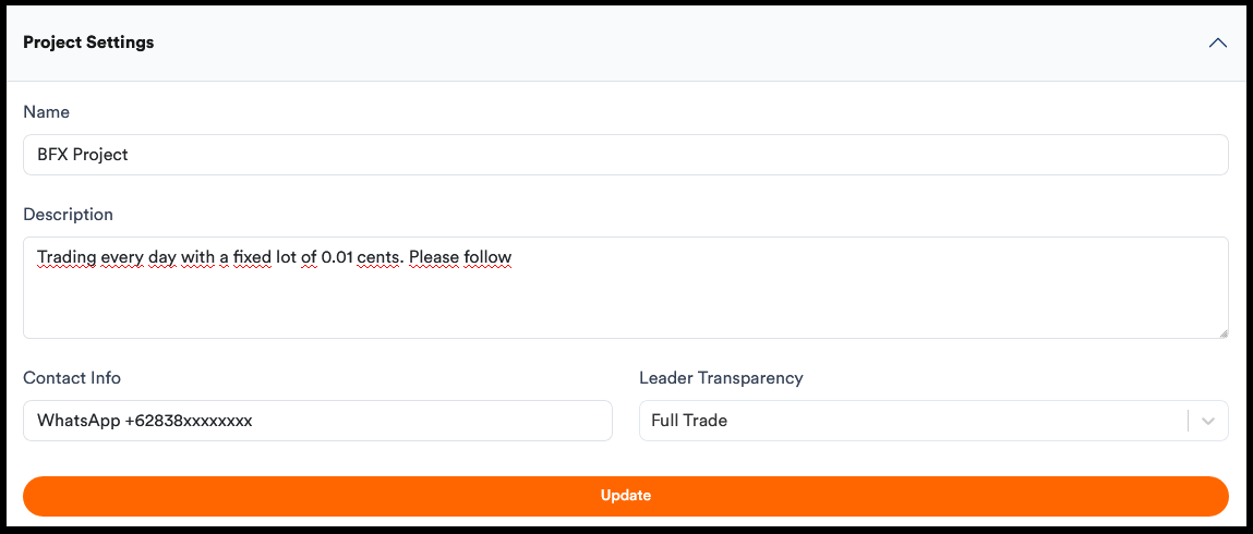 - Isi dan lengkapi formulir Project Setting lalu klik Update. (Contoh gambar di bawah ini)